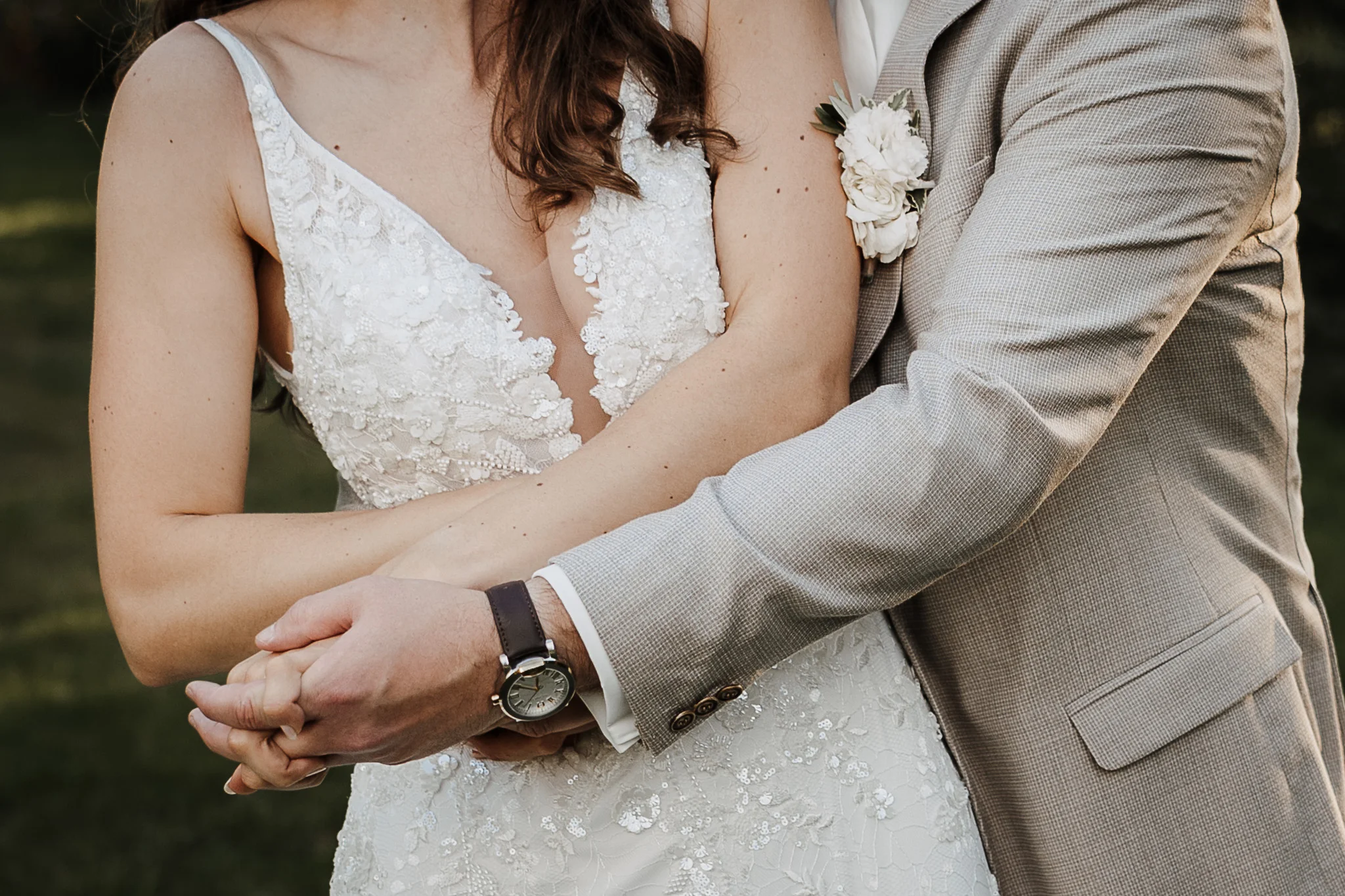 - Detailaufnahmen von Kleid, Schmuck und Blumen