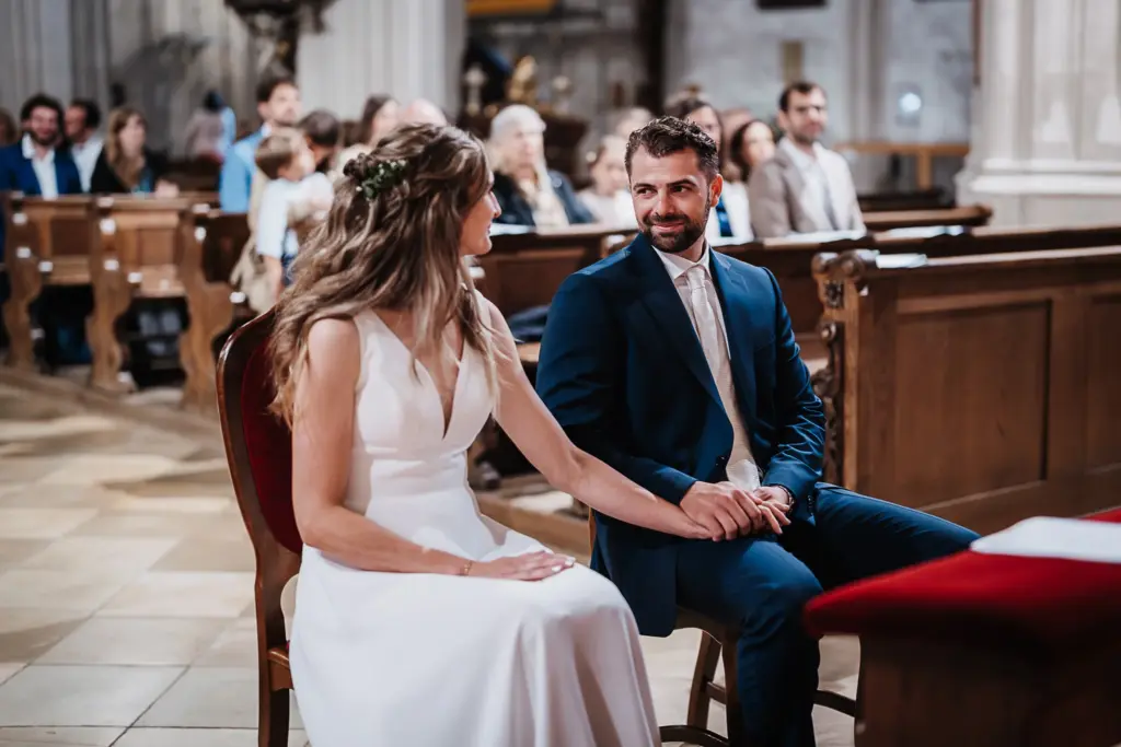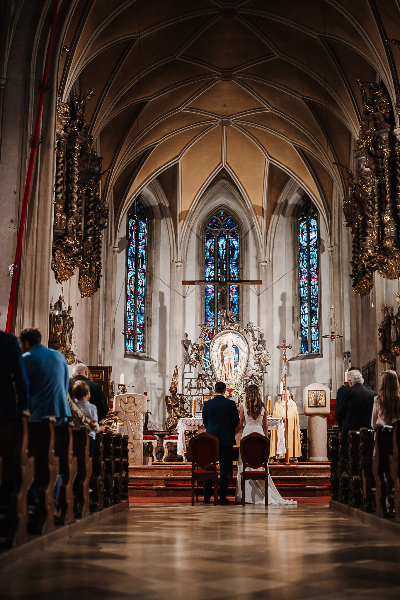 Eine kirchliche Hochzeit auf dem Bogenberg hat so eine besondere Atmosphäre – sie wirkt feierlich, aber nicht steif. Das Licht in der Kirche, die hohen Decken, die Details am Altar… das ist alles so unglaublich eindrucksvoll. Und wenn dann noch eure Lieblingsmenschen dabei sind und die Musik einsetzt – Zack, Tränchen-Alarm.